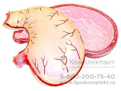 Пособие предназначено для использования в качестве демонстрационного материала. Модель высотой около 20 см, изготовлена из пластмассы. Модель является разборной, изображает желудок человека в разрезе, демонстрирует строение внешней и внутренней стенок желудка. Модель раскрашена. На модели цветом выделены следующие детали строения желудка: 1. Пищевод. 2. Дно желудка. 3. Большая кривизна. 4. Привратниковая часть. 5. Отверстие привратника. 6. Сфинктер привратника. 7. Складки слизистой оболочки. 8. Малая кривизна. 9. Тело желудка.