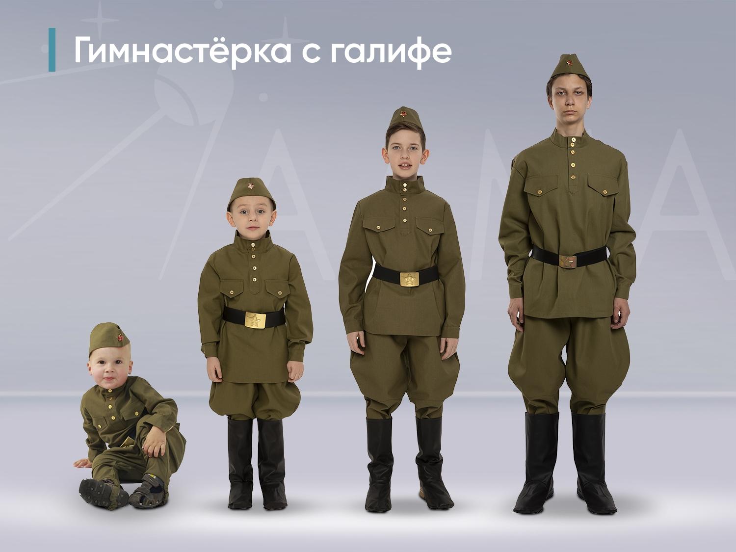 Детская и взрослая военная форма для мальчиков для организации театрализованных военно-патриотических постановок и парадов. Предлагаем полные комплекты военной формы, и по отдельности: гимнастёрки, брюки, пилотки, сапоги, вещмешки, плащи т.д. Все изделия отлично садятся на детские и взрослые фигуры и не сковывают движения. Одежда выполнена по лекалам времен ВОВ.