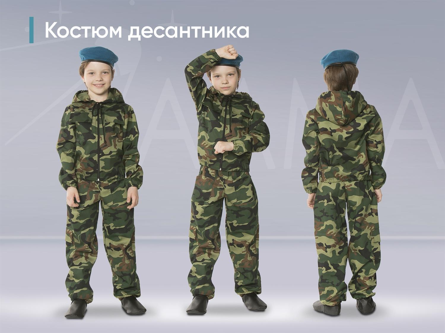 - Костюм десантника. Размеры: 104-110,116-122,128-134,140-146. Цвет: камуфляж, хаки.