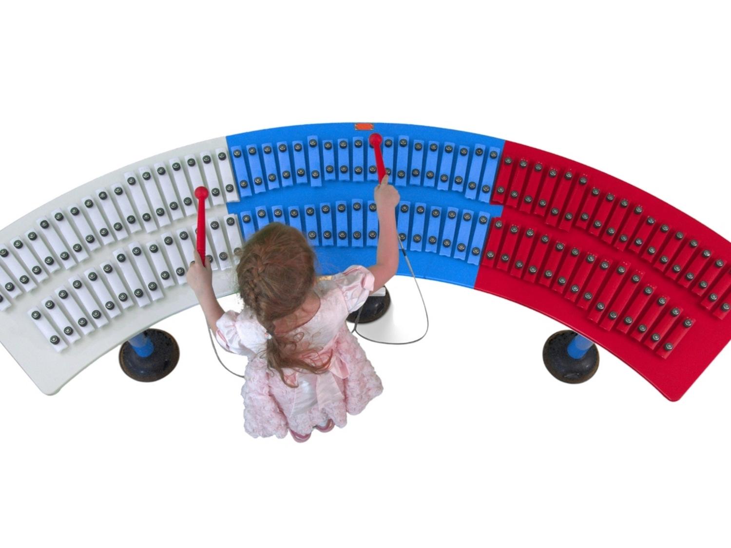 Металлофон в цветах российского триколора, нотные пластины музыкального инструмента расположены так, что любой пользователь может сыграть гимн России без предварительной музыкальной подготовки и пропеть его, пользуясь текстом, нанесенным на клавиши.