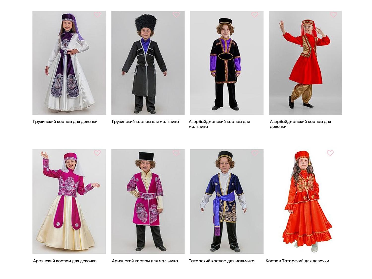 В линейке национальных нарядов представлены разнообразные варианты для детей и взрослых. Они выполнены с учетом традиций, поэтому реалистичны и соответствуют образу. Использовать такие костюмы можно для детских садов и общеобразовательных школ – например, для организации праздничных постановок или уроков патриотизма.