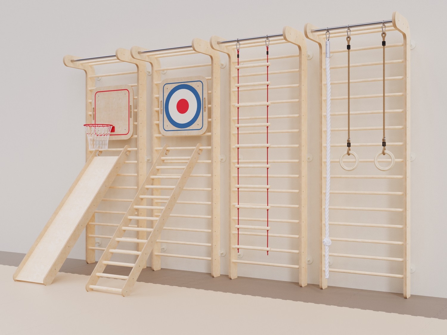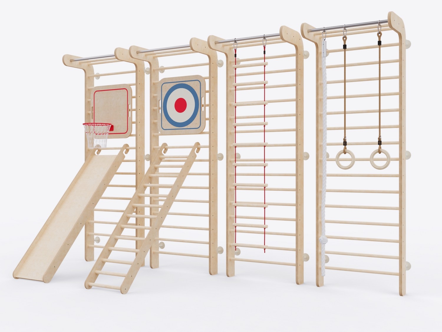 Комплекс состоит из четырех шведских стенок с турником с семью дополнительными спортивными снарядами, которые крепятся на стенку для проведения разных занятий, соревнований и игр.
