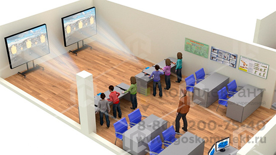 Система содержит в составе специализированные лазерные модули, прикрепляемые к стволу стандартных пневматических винтовок или страйкбольных приводов и позволяют осуществлять стрельбу стандартными боеприпасами с лазерной фиксацией выстрела. При нажатии спуска происходит пневматический выстрел боеприпасом и одновременно испускается невидимый лазерный импульс яркости, который детектируется с помощью камеры высокого разрешения. Также комплекс позволяет имитировать отдачу для страйкбольного вооружения. Интерактивная обстановка тира проецируется на два раздельных рубежа, на которых установлена проекционная система с устойчивым к попаданиям стандартных пневматических боеприпасов покрытием, позволяющим осуществлять проекцию и поглощать попадания. При этом лазерный модуль может быть закреплен на любом образце, тем самым наделив его функцией объективного контроля попадания. Также на первом рубеже сохраняется возможность использования стандартных бумажных мишеней для тренировки сдачи норм ГТО с возможностью переключения на пневматический огонь с лазерной фиксацией или на стрельбу лазерными макетами. Комплекс позволяет проводить сеанс обучения для 10 стрелков по двум типам вооружения одновременно, без опасности для обучаемых.